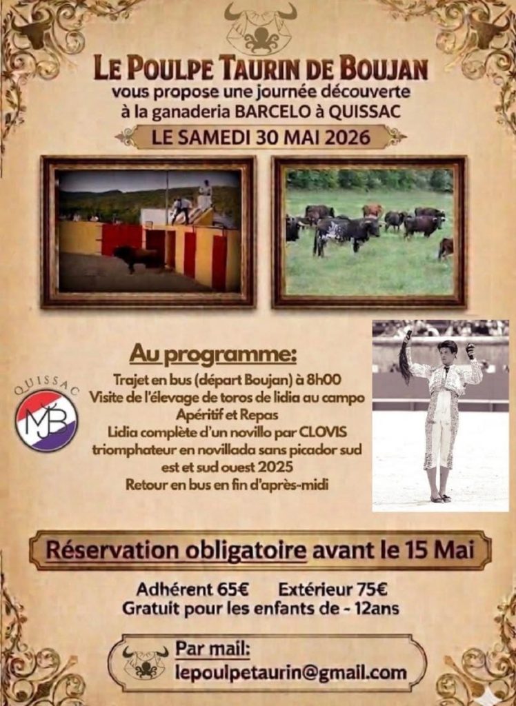 Le Poulpe Taurin Boujan est heureux de vous annoncer une magnifique journée le samedi 30 mai au sein de la ganaderia Barcelo. Au programme, une lidia complète d’un novillo pour Clovis Germain triomphateur 2025 sud-est et sud-ouest en sans piquée.