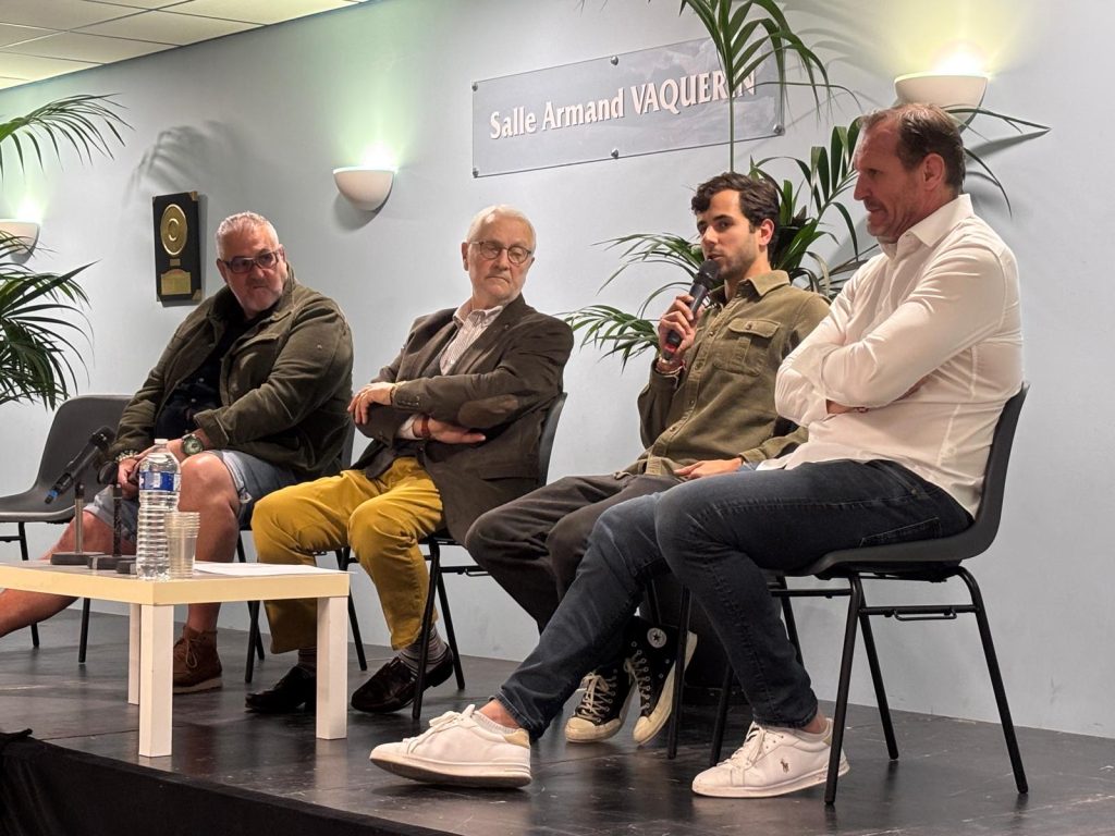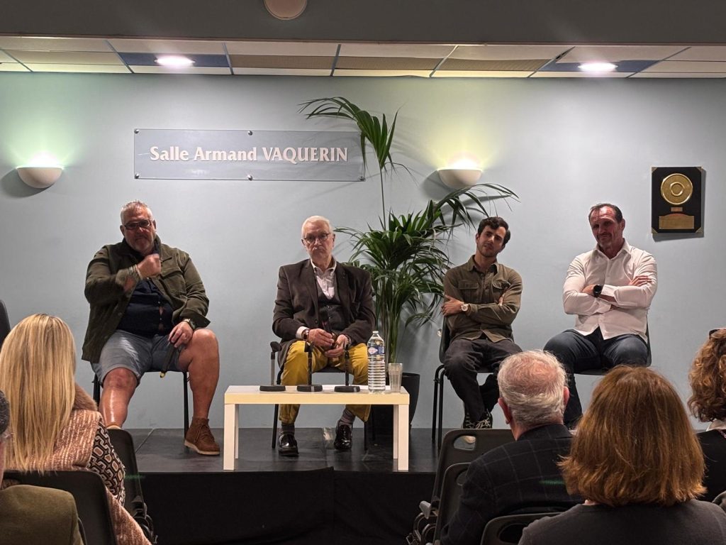 Le stade Raoul Barrière accueillait en fin d’après-midi 80 aficionados a los toros et au ballon ovale venus écouter des personnalités rugbystiques et taurines sur les similitudes entre le joueur de rugby et le torero. Christophe Urios, entraîneur d’un club de Top 14 et propiétaire du Château Pépusque , Gilles Belzons, ancien joueur de Narbonne et Carlos Olsina, Matador de Toros biterrois ont répondu aux questions posées par Michel Bousquet qui jouait le rôle de maître de cérémonie. Le Maire de Béziers était venu saluer les intervenants. Un échange avec la salle a suivi et permit aux 3 invités de répondre à toutes les questions.